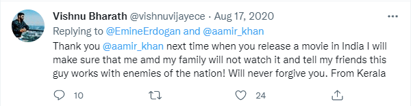 ആമിർ ഖാൻ ബഹിഷ്കരിക്കുക എന്ന ഹാഷ്ടാഗ് സോഷ്യൽ മീഡിയയിൽ ട്രെൻഡ് ആയി തുടങ്ങി. ‘ലാൽ സിംഗ് ഛദ്ദ’ ബഹിഷ്കരിക്കണമെന്ന് ആളുകൾ ആവശ്യപ്പെടാൻ തുടങ്ങി. അദ്ദേഹത്തിന്റെ സിനിമകൾ ഒരിക്കലും കാണില്ലെന്ന് നെറ്റിസൺസ് പ്രതിജ്ഞയെടുത്തു.